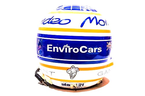 THIS HELMET WAS WORN AT BATHURST 1997 AND FEATURES AIR VENTS AT THE TOP AND BOTTOM AND A PEAK.
