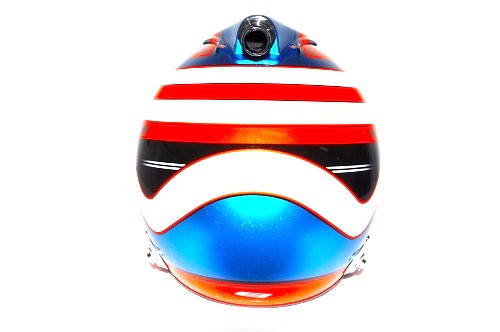 THIS HELMET FEATURES HANS DEVICE ANCHOR POSTS, TOP AND BOTTOM AIR VENTS, A TOP AIR INTAKE PORT, A RADIO WIRE CLIP AND A TINTED VISOR.
