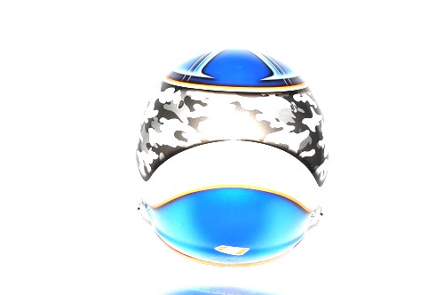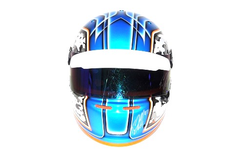 THIS HELMET FEATURES HANS DEVICE ANCHOR POSTS, BOTTOM AIR VENTS AND A TINTED VISOR.