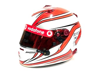 THE HELMET HAS TOP AND BOTTOM AIR VENTS, A TINTED VISOR AND HANS DEVICE ANCHOR POSTS.