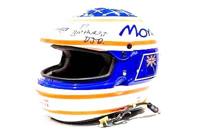 THIS HELMET WAS WORN AT BATHURST 1997 AND FEATURES AIR VENTS AT THE TOP AND BOTTOM AND A PEAK.