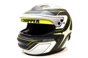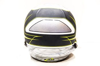 THIS HELMET FEATURES TOP AIR VENTS, A SIDE AIR PORT, HANS DEVICE ANCHOR POSTS AND A PEAK WITH HALF VISOR.